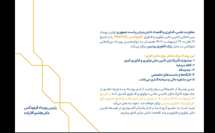 عمران (ابنیه، سد، راه و باند، تونل، ایستگاههای مترو و ...)؛ کشاورزی؛ نفت و انرژی (صنایع بالادستی و پائیندستی نفت و گاز، نیروگاه و انرژی های نو و...)؛ صنعت و معدن (فولاد، خودرو، سیلو، نفت، سیمان، مخازن ذخیره، استخراج و...)؛ محیطزیست و پسماند؛ بازرگانی (محصولات، تجهیزات و نهادههای کشاورزی، دامی و شیلات، انواع سموم، بذر و ...)؛ صنعت توریسم و گردشگری؛ مشاوره مهندسی؛ مالی و سرمایهگذاری؛ فناوری اطلاعات و ارتباطات و توسعه کسبوکارهای نو